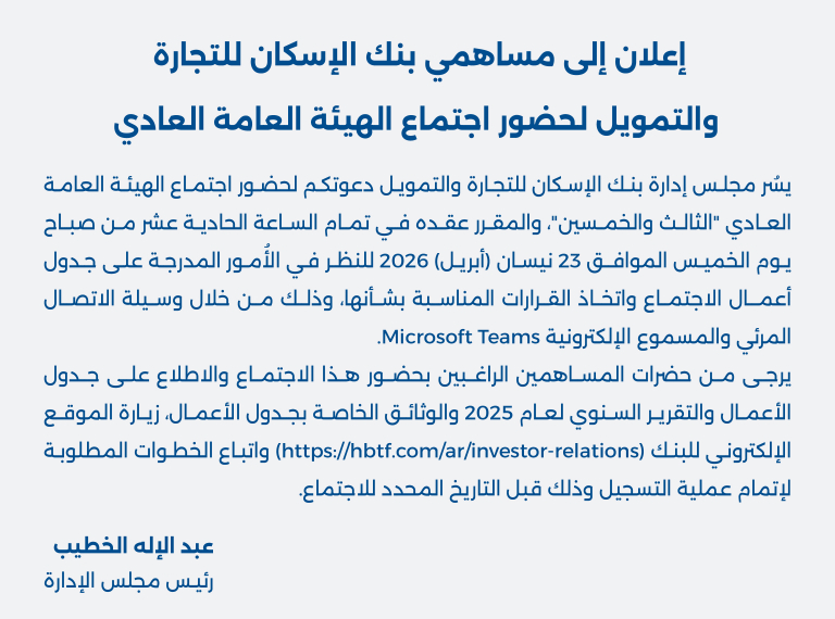 اعرف اكثرمهما كانت طموحاتك واحتياجاتك، فإن بنك الإسكان للتجارة والتمويل يسعى للعمل على تلبيتها من خلال مجموعة متكاملة من الخدمات المصممة لجعل العمل المصرفي أكثر سهولة وملائمة لمتطلباتك.